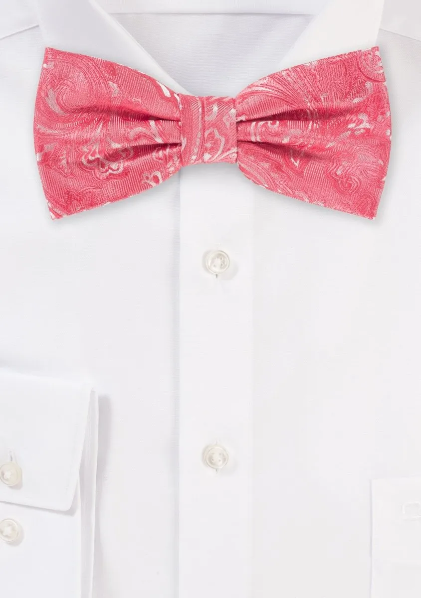 The Caribbean Coral Proper Paisley Bowtie is wearing is the perfect accessory to set your wedding apart from others. It has the rich appearance and supple smoothness of silk despite being far more affordable. The pattern is intricately woven into the fabric, and for emphasis, we've added a touch of silver. By doing so, we end up with a tie that has a smooth surface and the potential to shimmer when the light hits it. It pairs quite well with the majority of tuxedos and suits. A white shirt is always a safe option.